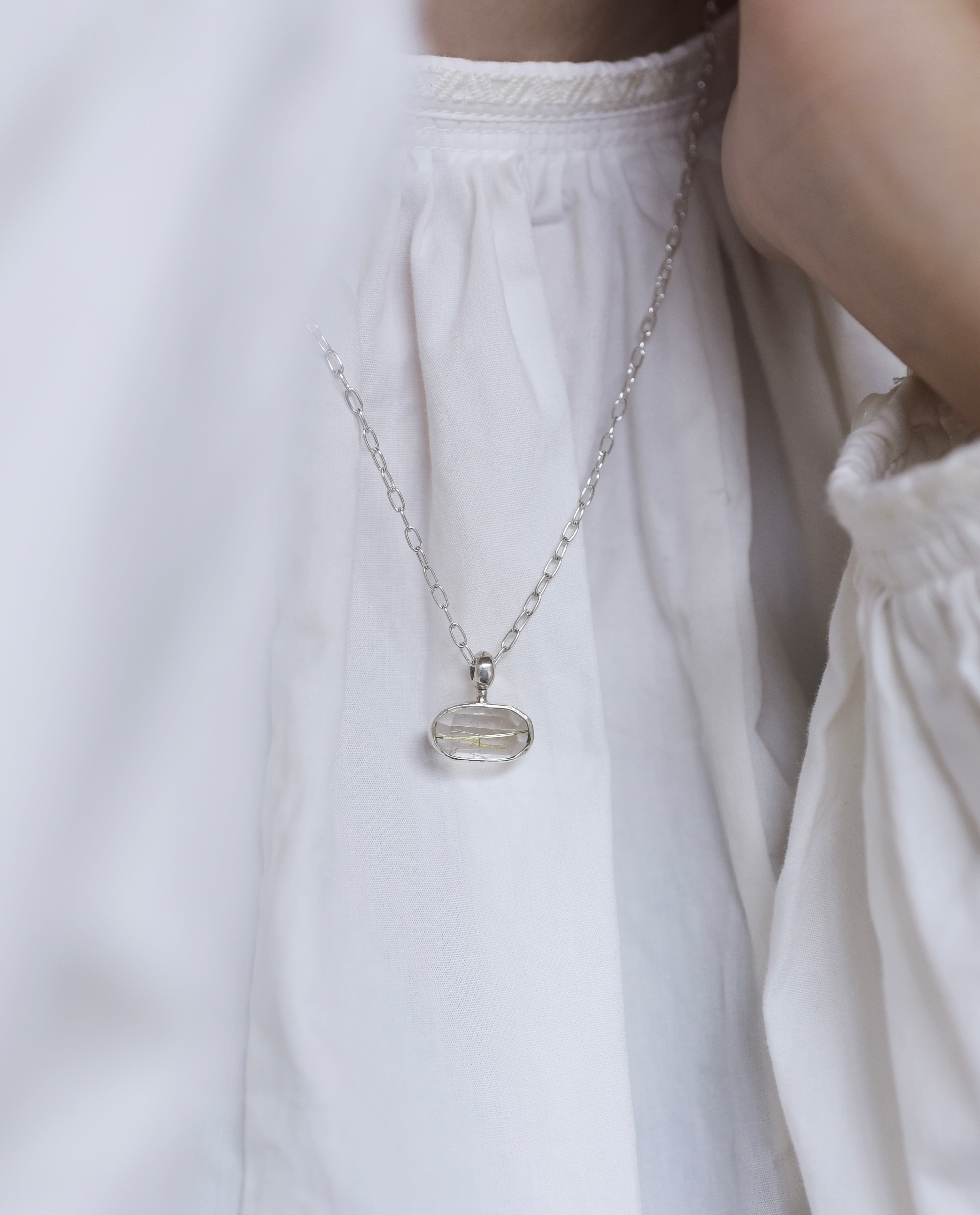 服の上に乗せて楽しめる、少し長めの45cmチェーンを使用しています